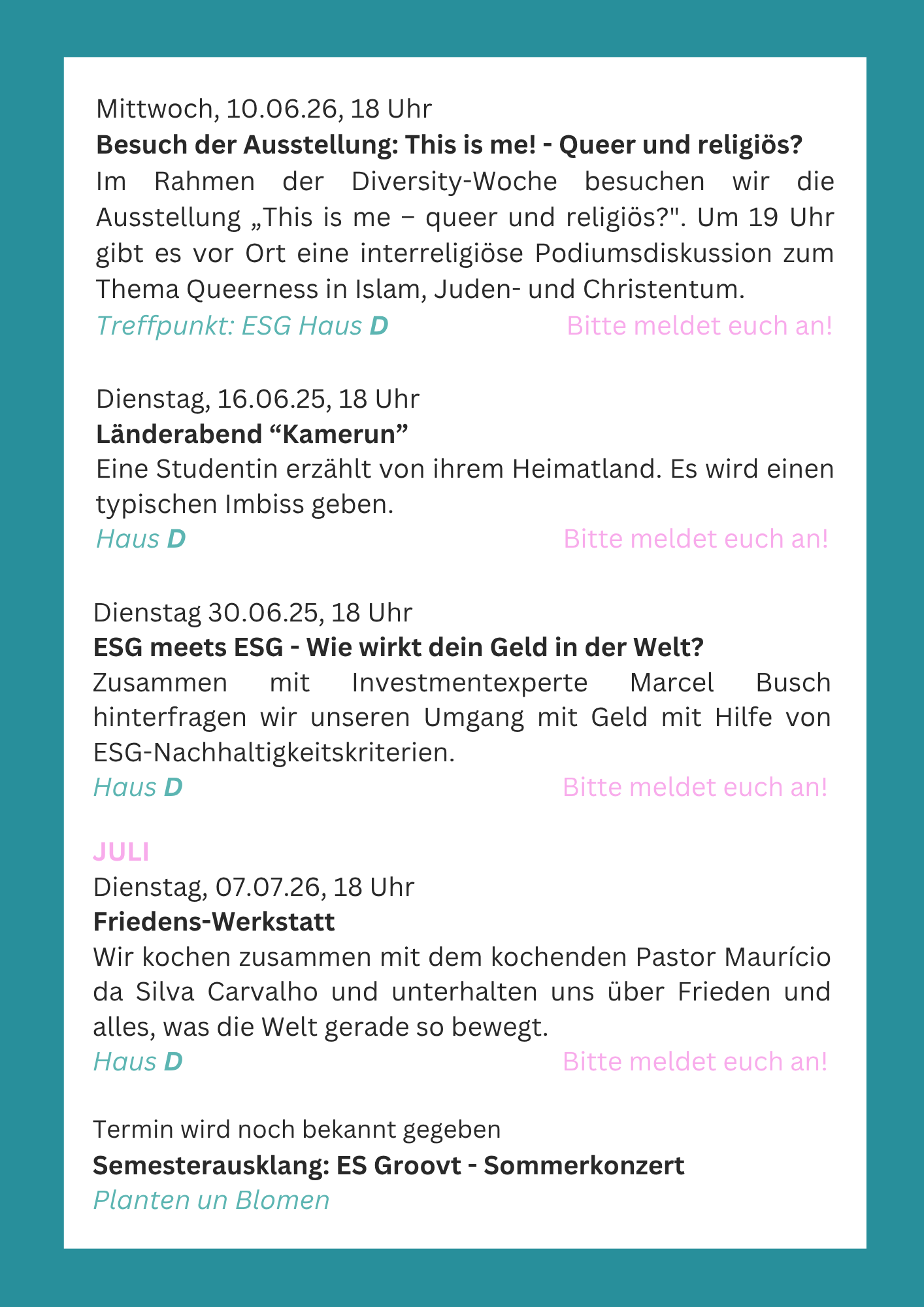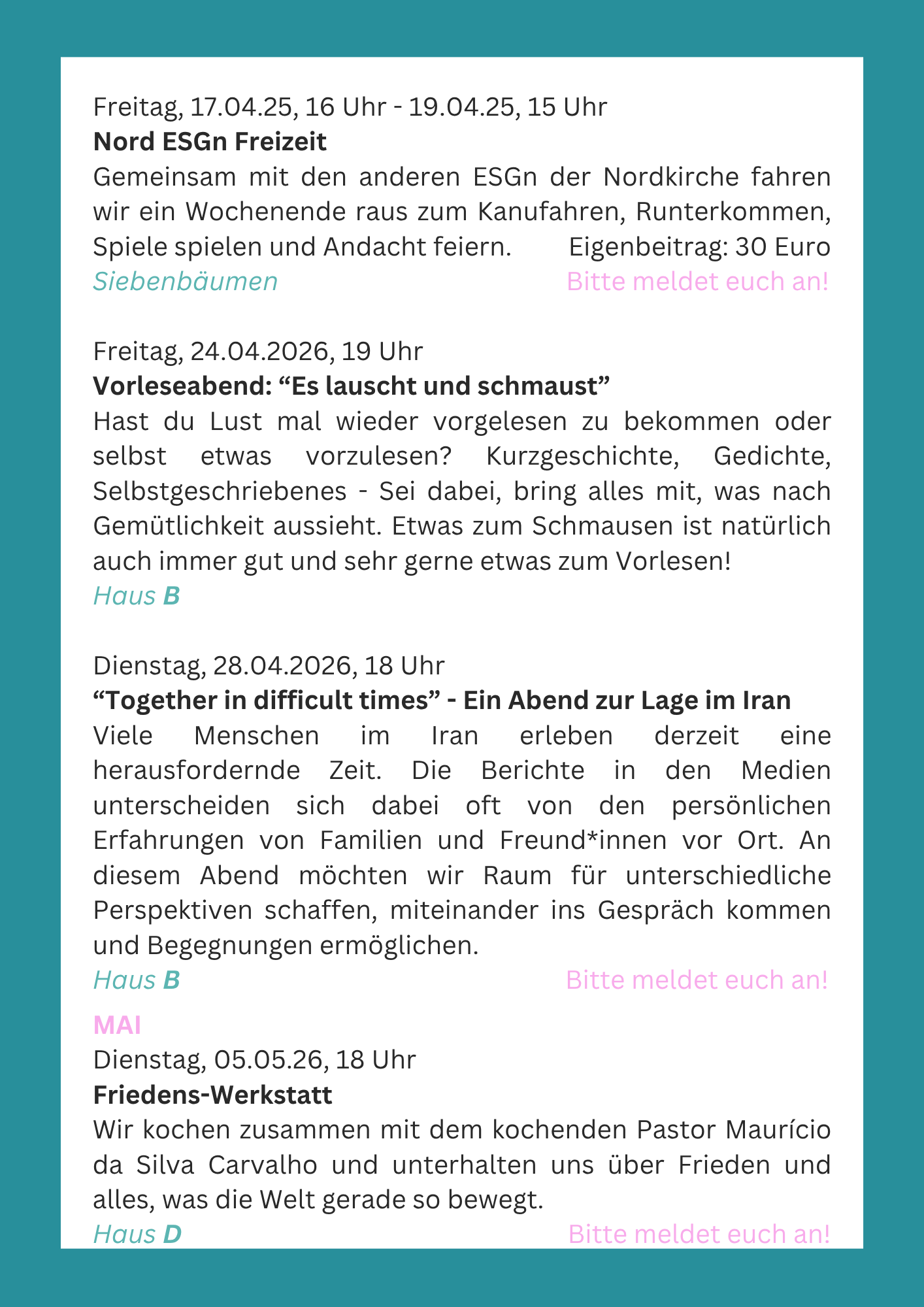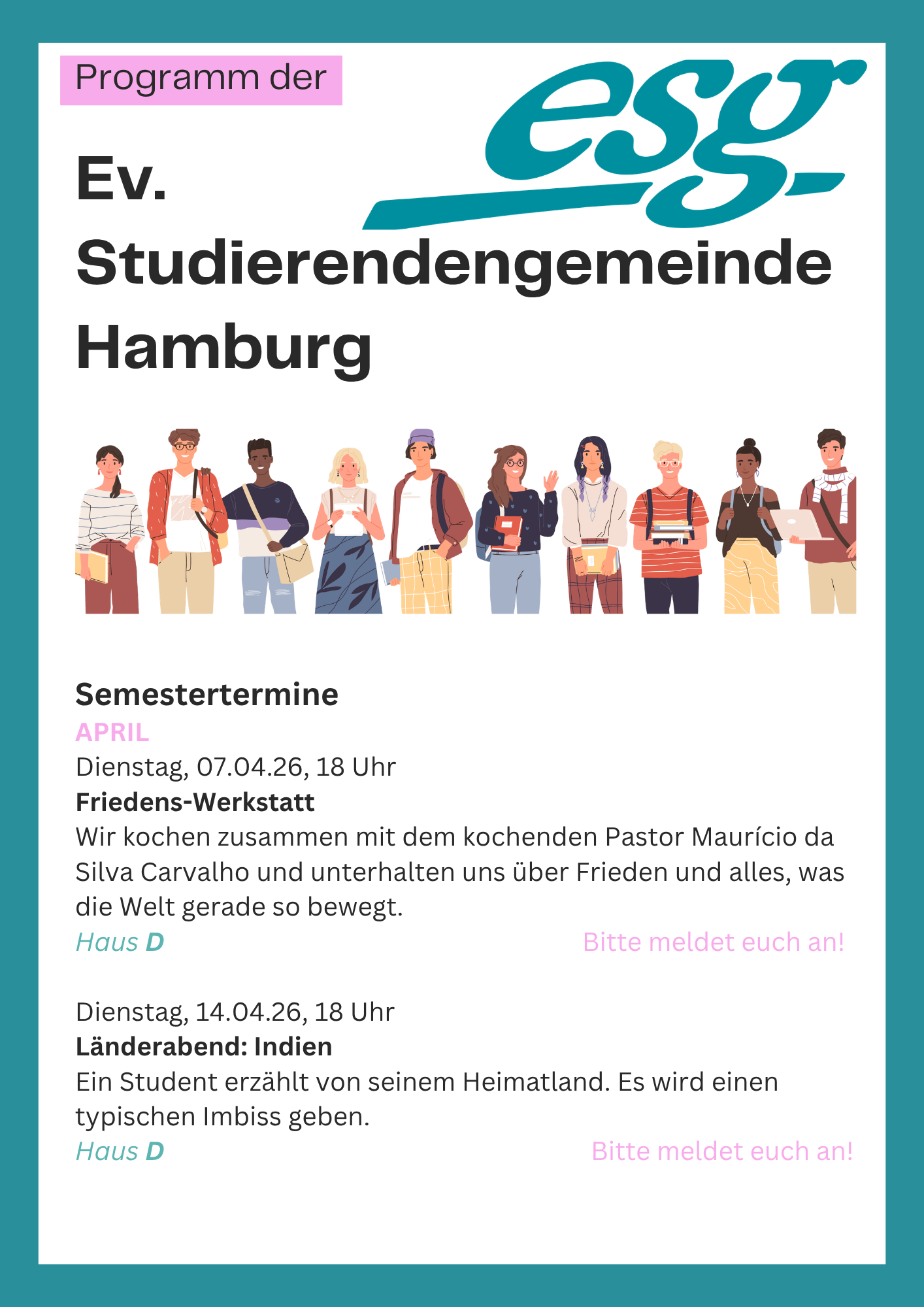 Bitte beachte, dass auch wir manchmal im Urlaub sind, deshalb melde dich am besten bis zum Vorabend 18 Uhr unter: hamburg@esg.nordkirche.de an.